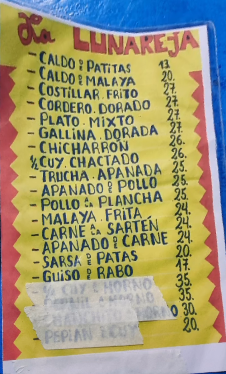The menu at La Lunareja offers a delightful selection of Peruvian dishes, each with its own unique flavors and preparation styles. One of the standout items is the Costillar Frito, a crispy fried rib dish that delivers a perfect balance of tenderness and flavor. Another popular choice is the Fried Trout, a dish that showcases the fresh, natural taste of fish, lightly fried to perfection. For those who love fresh fruit, the Frutillada de Fresa is a refreshing strawberry-based dessert that perfectly complements the savory dishes.